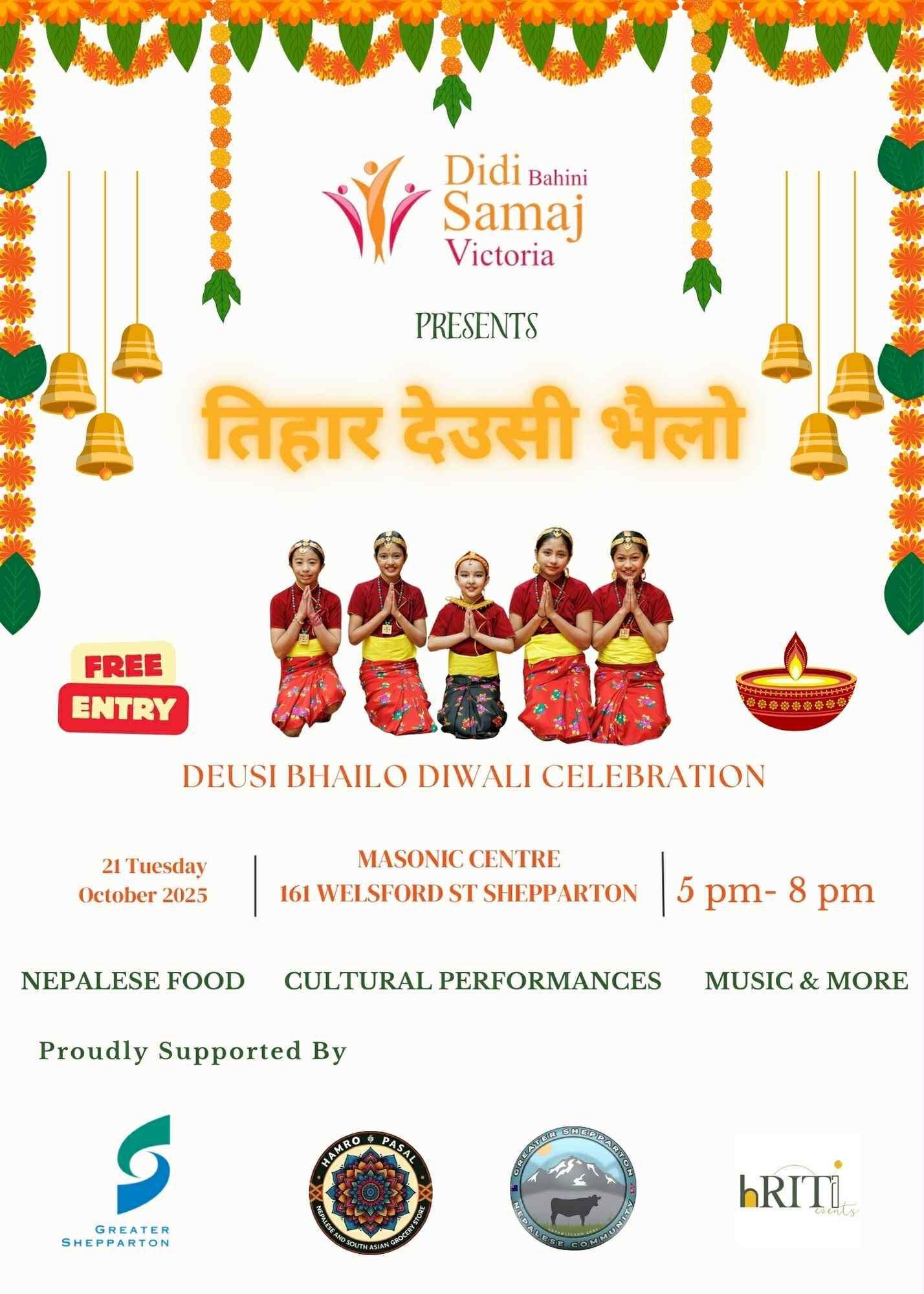 The celebration will feature cultural performances, including traditional dance and Deusi Bhailo. The community will also provide light refreshments at the event. Proudly supported by the Greater Shepparton City Council and our local partners Hamro Pasal and Hriti Events.