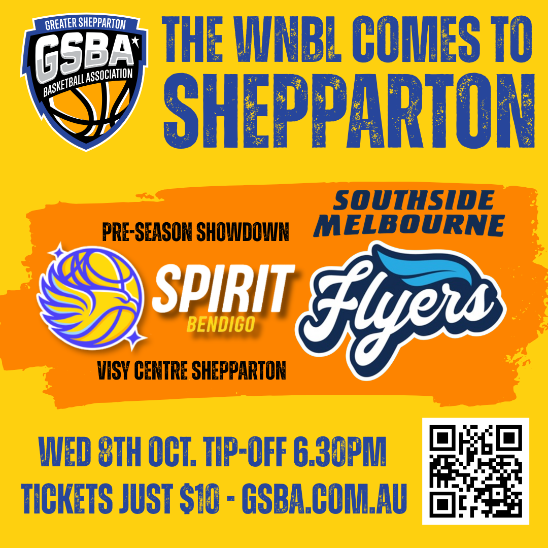 WNBL is coming to Shepparton: Bendigo Spirit vs Southside Flyers in a pre season game, Wednesday 8 October at Visy Stadium, Parkside Drive Shepparton.
