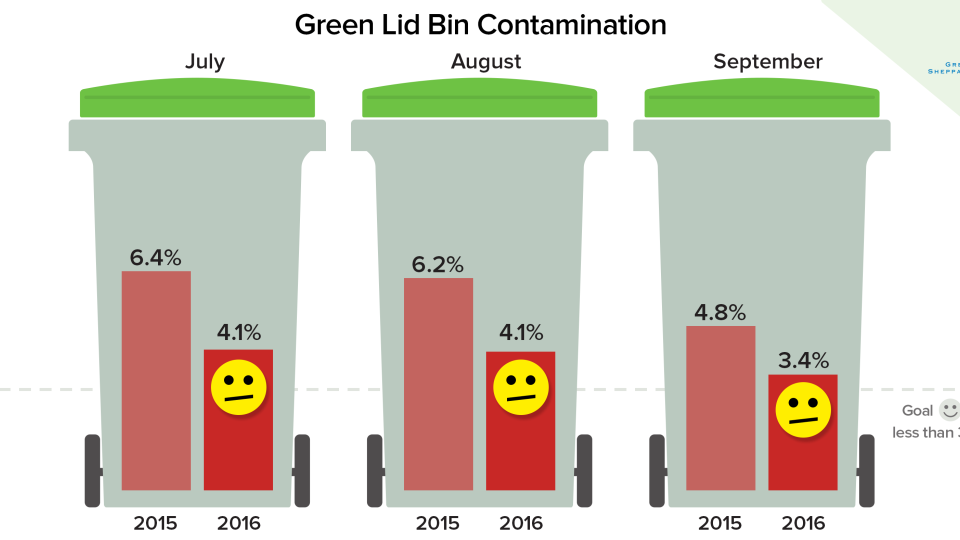 Green lid bin contamination rates for September 2016 have decreased to 3.38 per cent, which is a drop of 0.67 per cent since August. Read more