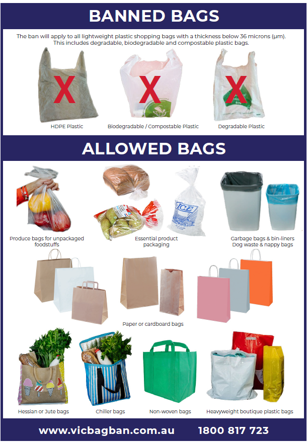 The Victorian Government has engaged the National Retailers Association (NRA) to work with Victorian businesses in preparing for the ban. The NRA has set up a toll-free Bag Ban Hotline (1800 817 723) to provide business with support in transitioning away from single use lightweight plastic bags. And detailed information about the ban can be found at vicbagban.com.au and plasticbags.gov.au.