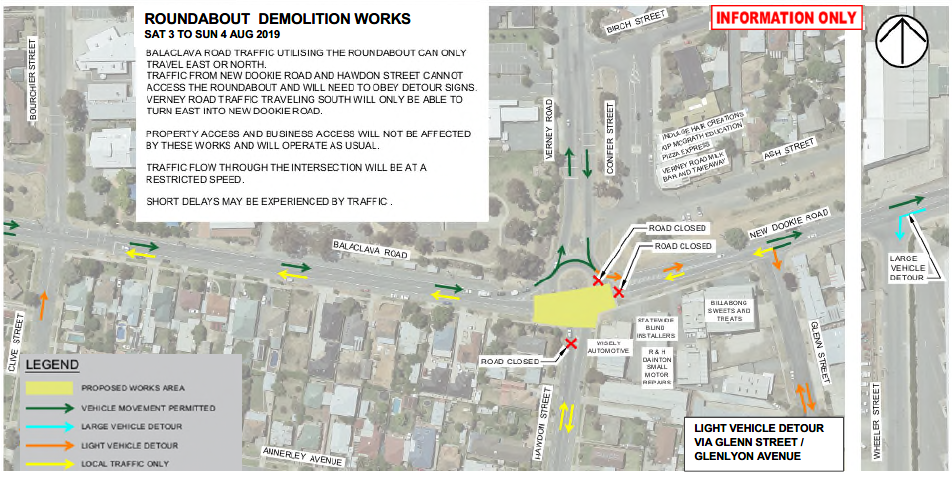 Traffic travelling along New Dookie Road and Hawdon Street will not be able to access the roundabout during the demolition works.