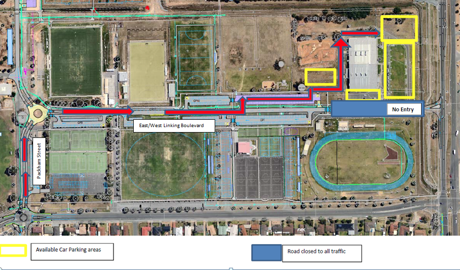 To enter and exit the Shepparton Sports Stadium, patrons must enter via Packham Street and follow the newly created East/West boulevard, as per the below map. There will be some minor works that still need to occur in and around the precinct to complete the East/West boulevard roadway.