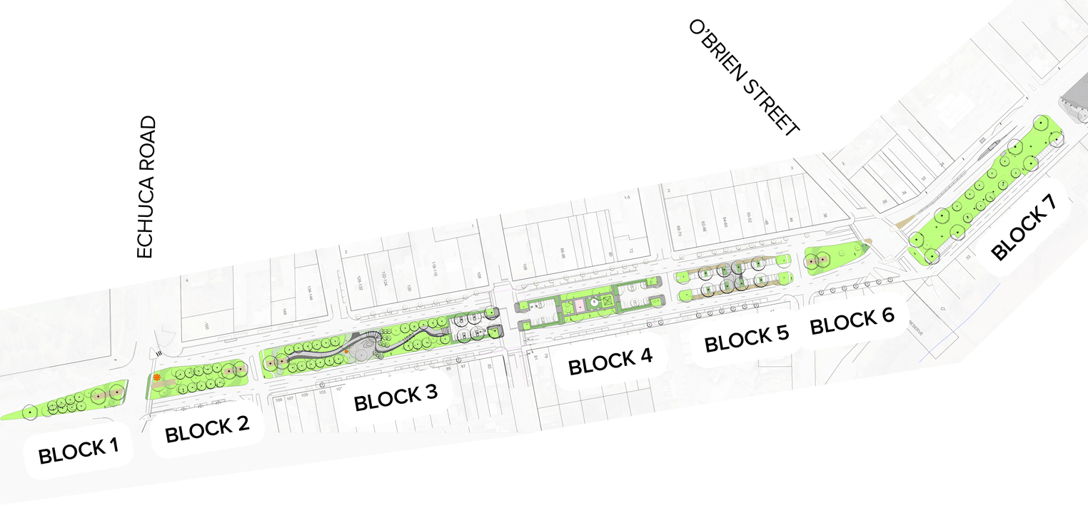 In 2015 Council, in consultation with the Mooroopna community, developed landscaping concept plans with the area broken down into 8 blocks, including the Mooroopna War Memorial. Blocks 1, 2, 6 and 8 were constructed in the 2019/20 financial year and Council is now seeking feedback in relation to the design of blocks 3 and 5.