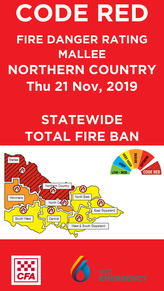 A Code Red Day signals the worst possible grass and bushfire conditions and the safest place to be is away from high risk fire areas within those Districts.