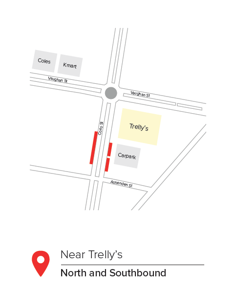 The temporary bus interchange in Corio Street will be operational from Monday 2 November, 2020 and will be located between Vaughan Street and Ashenden Street.