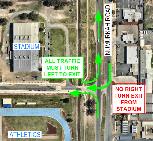 Local residents using Sports City will now have access into the area from Numurkah Road but will not be able to turn right when exiting Sports City onto Numurkah Road. Council advises drivers to use the Packham Street exit if they wish to travel south.