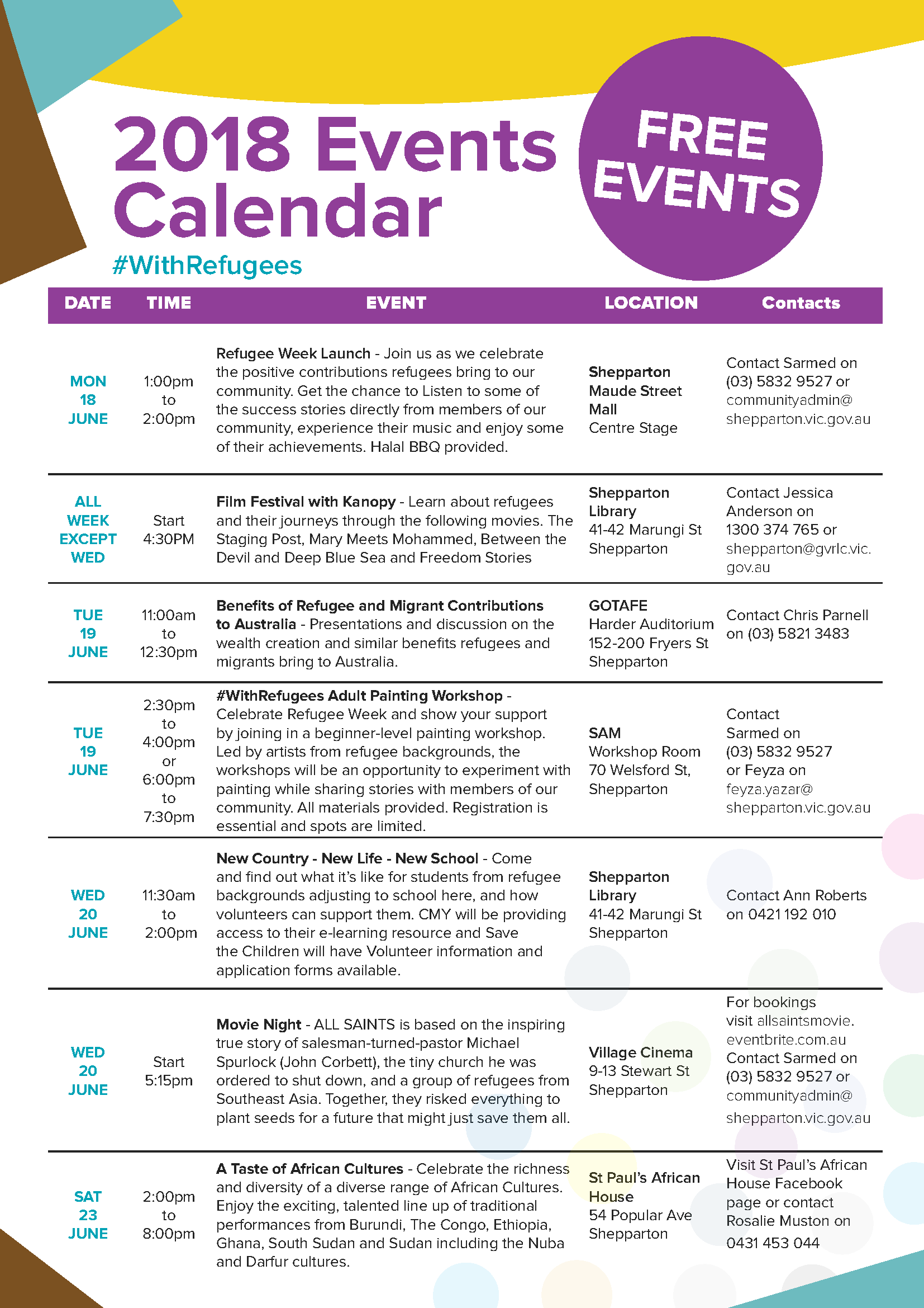 The Greater Shepparton community will celebrate Refugee Week from Sunday 17 to Saturday 23 June. The theme for Refugee Week 2018 in Australia is #WithRefugees.