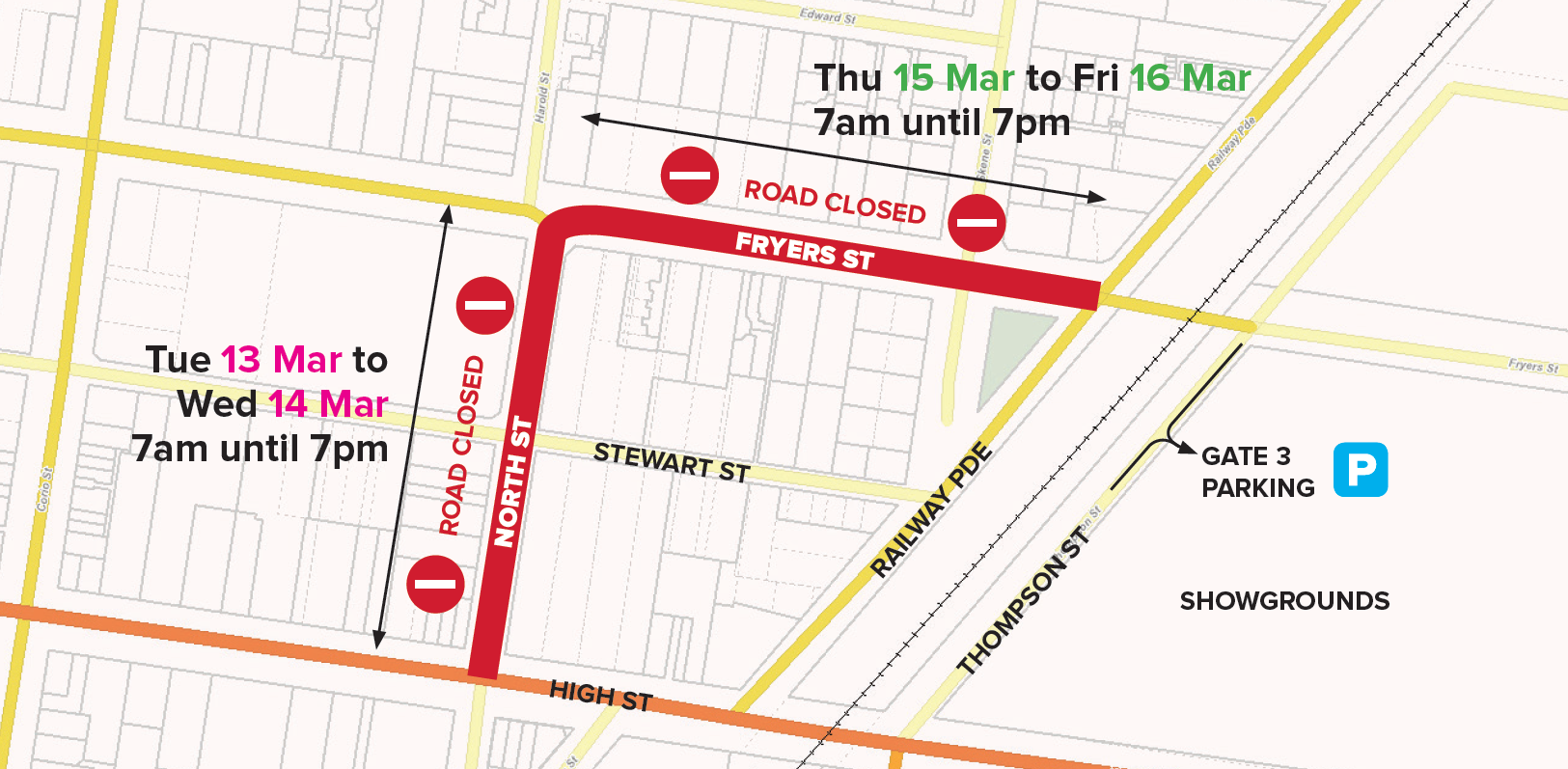 Road closure will occur on Fryers Street between North Street and Railway Parade on Thursday 15 and Friday 16 March.
