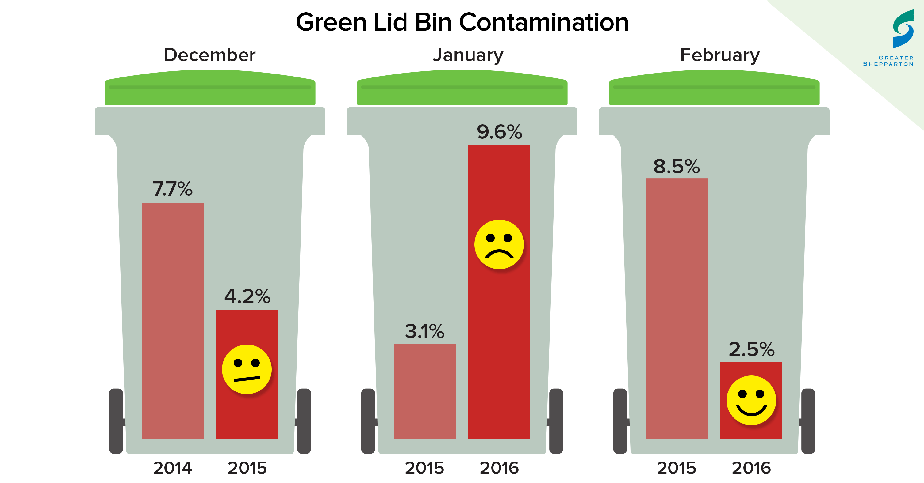 Contamination of the green lid bins for the month of February 2016 was down to 2.54 per cent compared to 8.5 per cent in February last year.